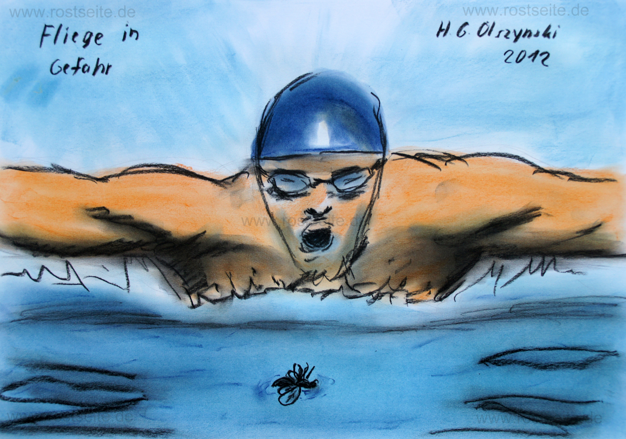 Im Hallenbad sah ich eine Fliege hilflos auf der Wasseroberfläche schwimmen. Da kam mir diese Bildidee. |